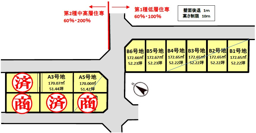 ■B街区のみ低層住専により壁面後退1m、高さ制限10mあり