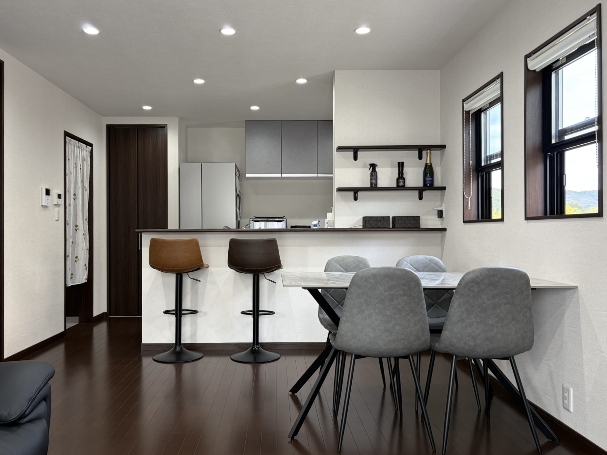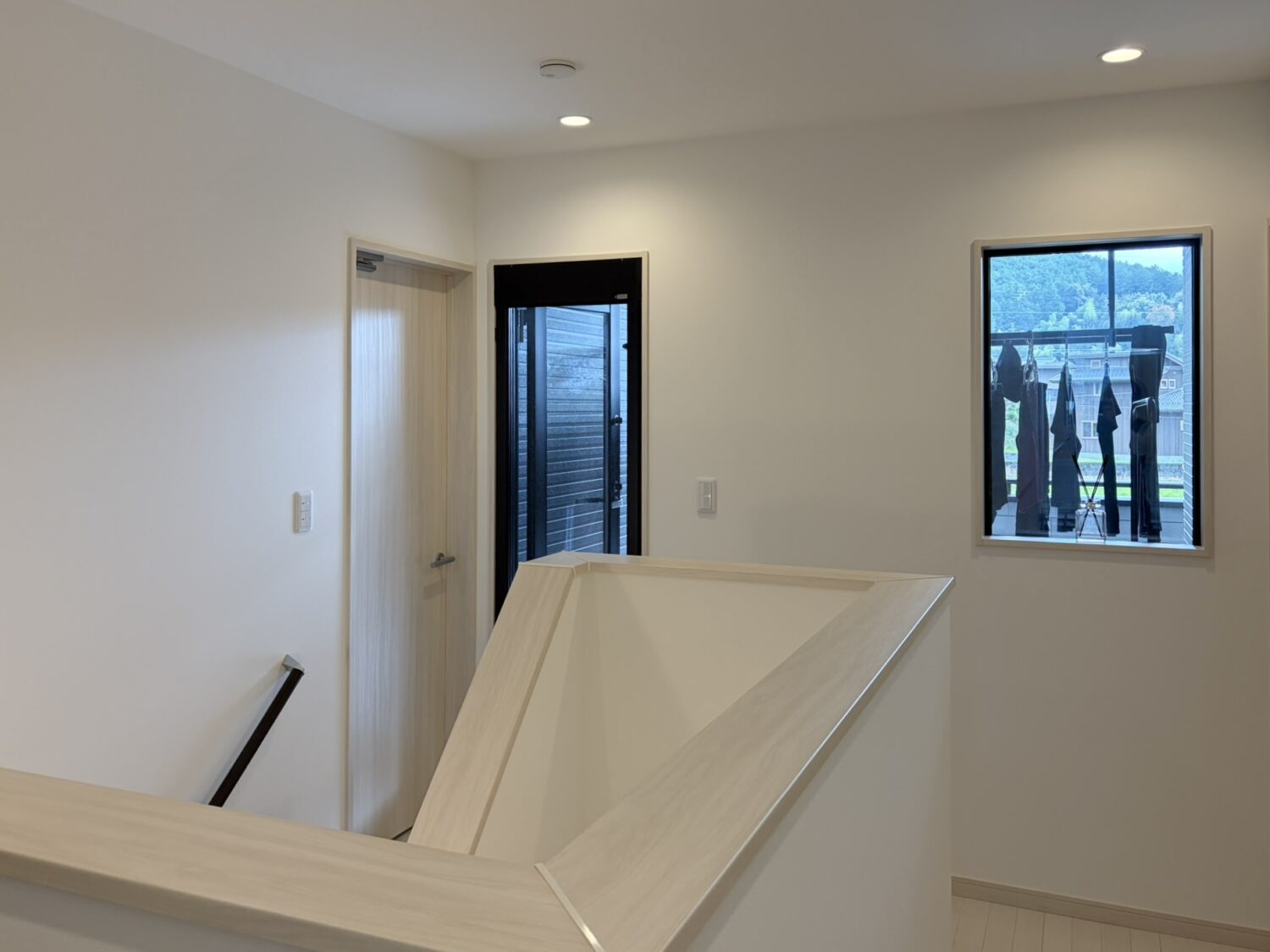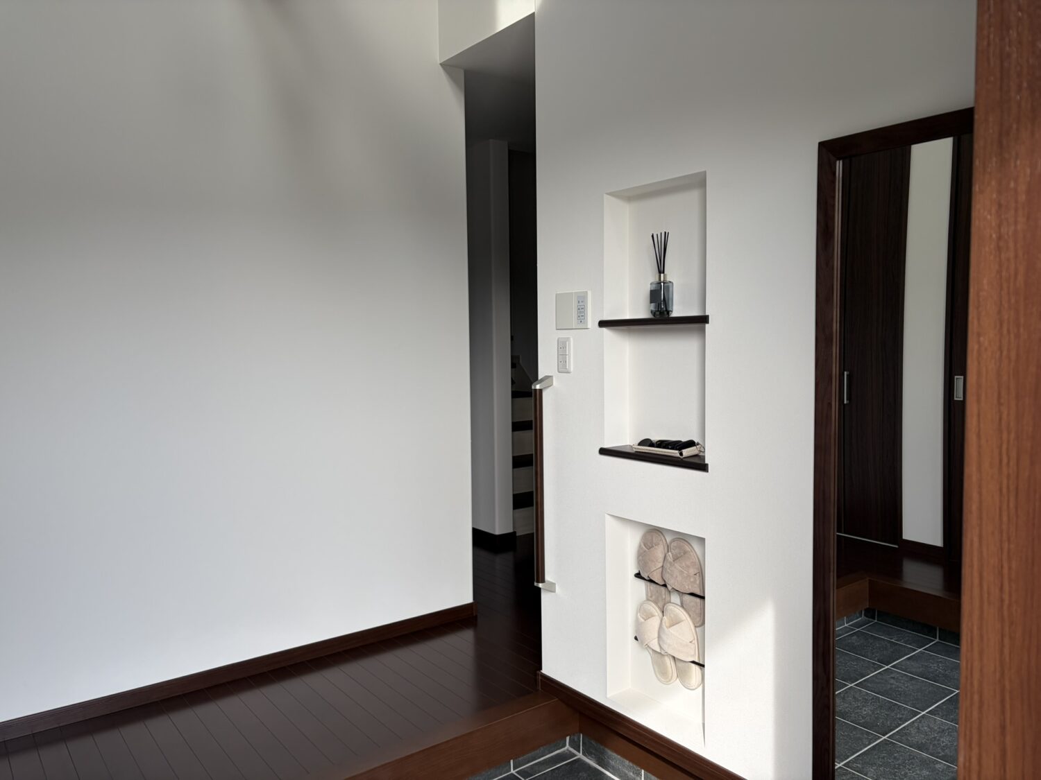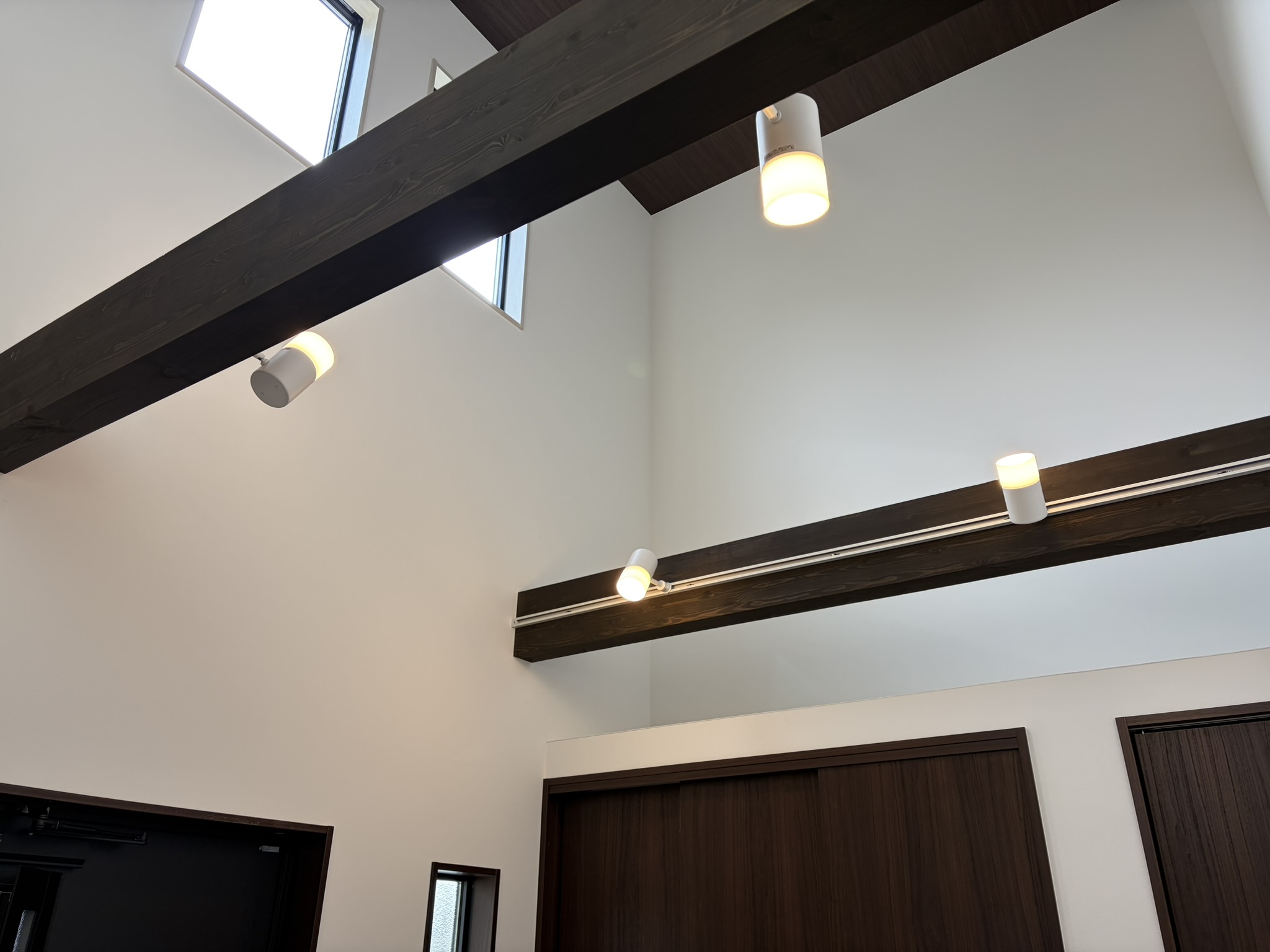 室内は白と濃色フローリングのコントラストが美しい空間に。吹き抜けと梁を活かしたリビングは、開放感とくつろぎを両立しました。生活動線や収納にも配慮し、デザイン性と暮らしやすさを兼ね備えた一邸です。