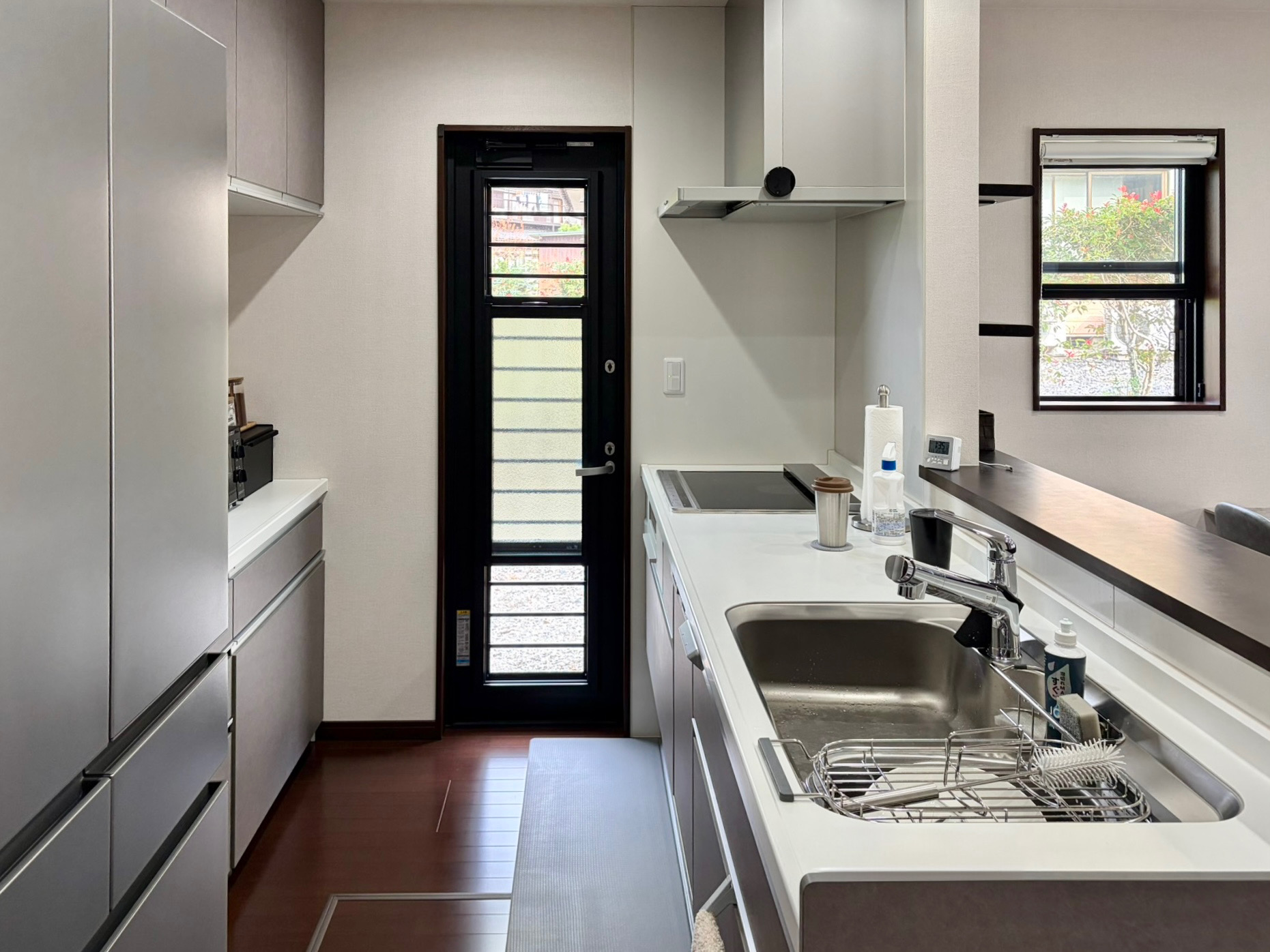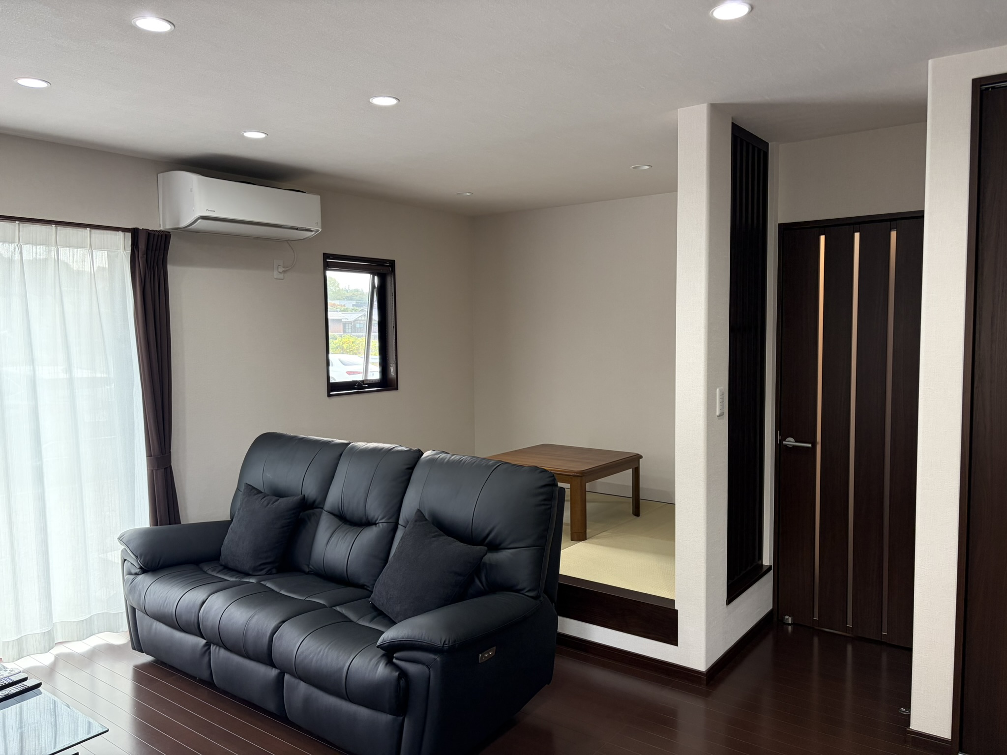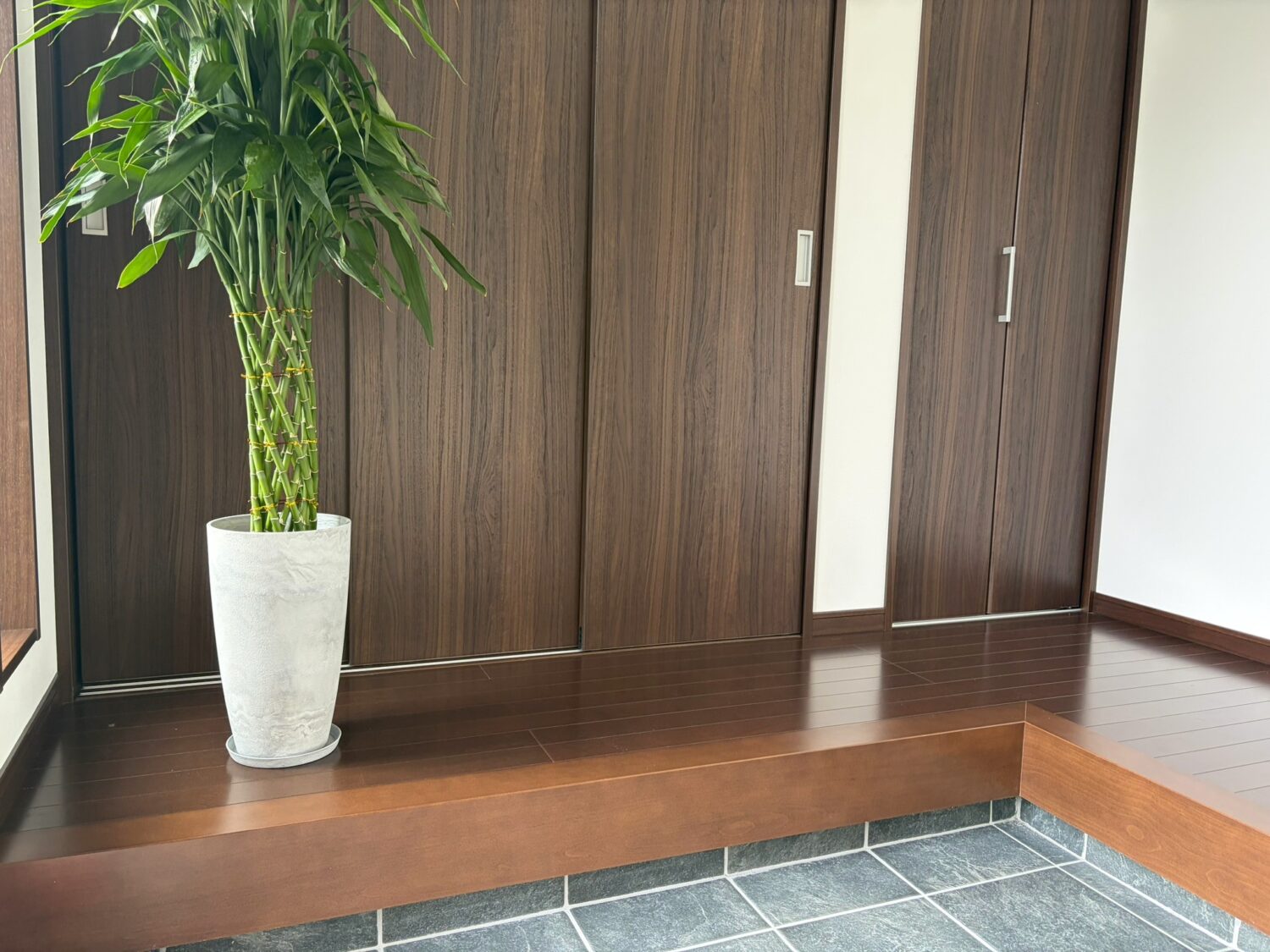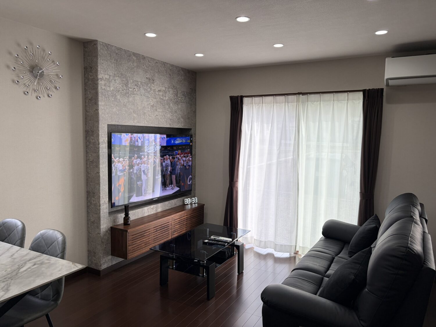 室内は白と濃色フローリングのコントラストが美しい空間に。吹き抜けと梁を活かしたリビングは、開放感とくつろぎを両立しました。生活動線や収納にも配慮し、デザイン性と暮らしやすさを兼ね備えた一邸です。