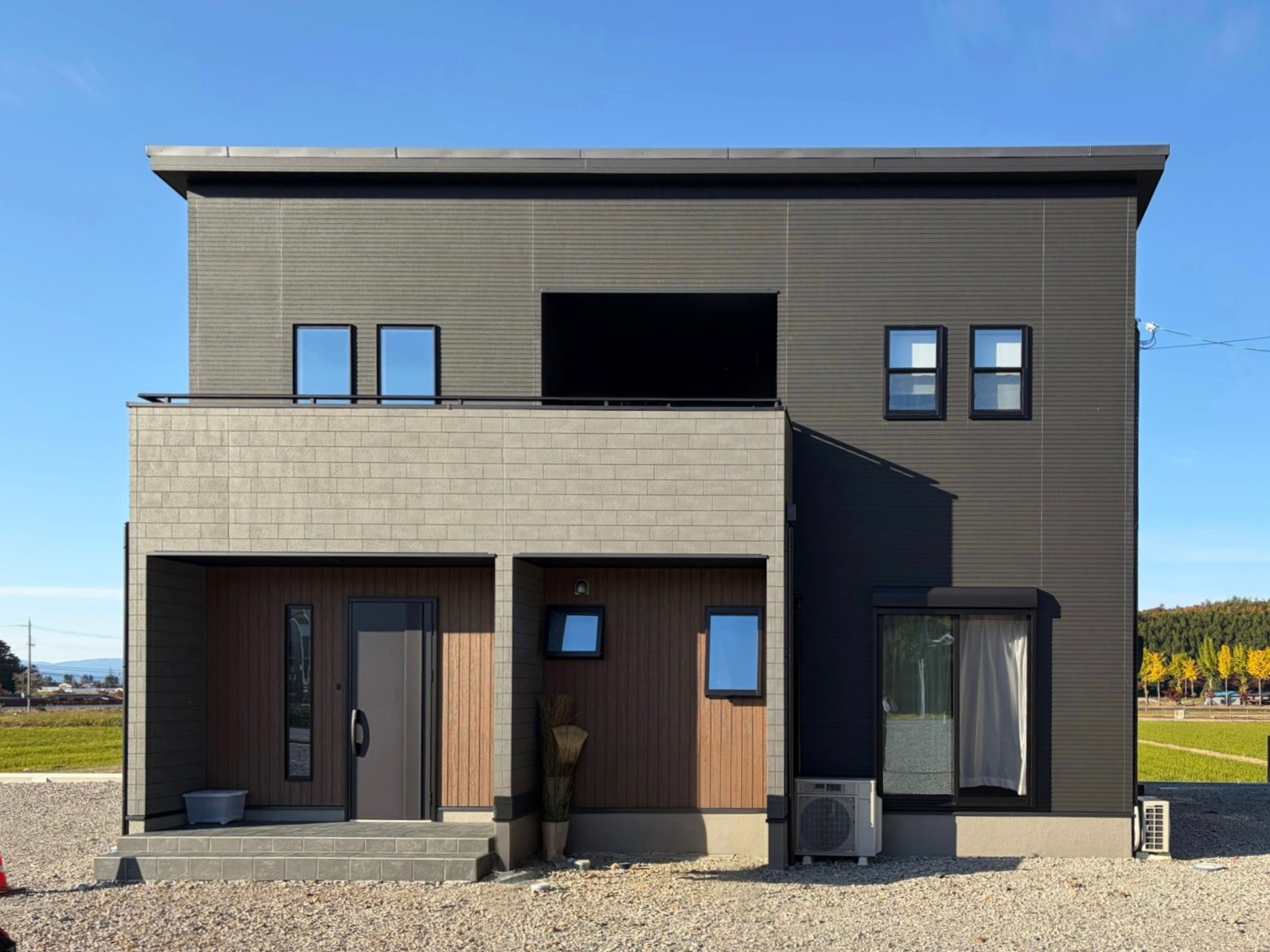 ダークトーンを基調とした外観に、素材の貼り分けで表情を持たせたシンプルモダンな住まい。直線的なフォルムが、落ち着きと存在感を演出します。