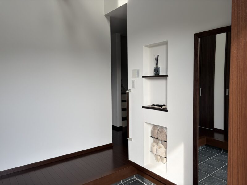 ダークトーンを基調とした外観に、素材の貼り分けで表情を持たせたシンプルモダンな住まい。室内は白と濃色フローリングのコントラストが美しい空間に。吹き抜けと梁を活かしたリビングは、開放感とくつろぎを両立しました。生活動線や収納にも配慮し、デザイン性と暮らしやすさを兼ね備えた一邸です。